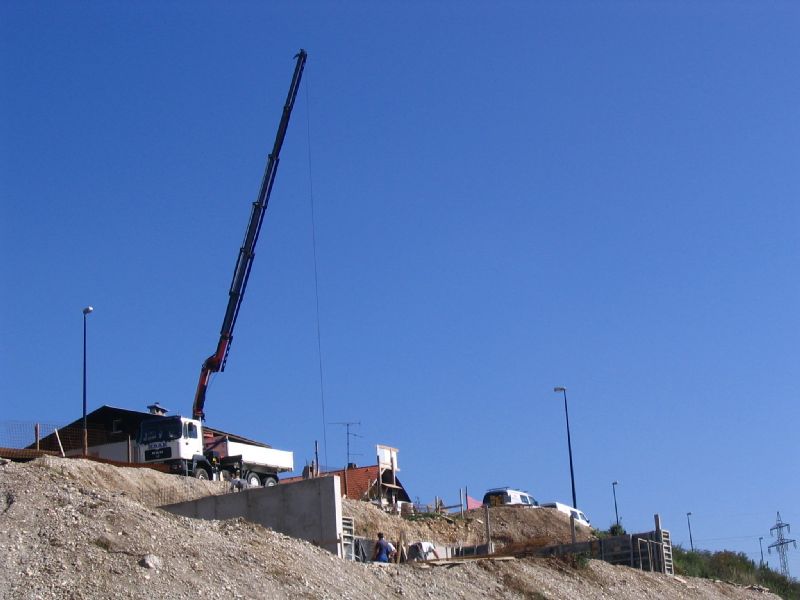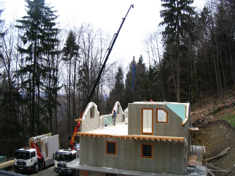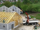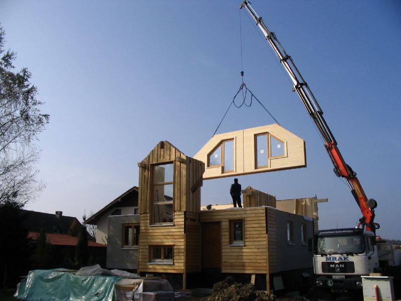 izvajanje del z avtodvigalom pri montaži objektov (Jelovica Hiše, Damahaus, KLH hiše, Legoles...),